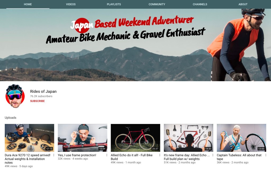 The vlog of Tobias, a Swedish cyclist living in Japan. It is frankly brilliant, in part due to Tobias’ quirky presentation style. A semi obsessed weight weenie we seem to share many worrying traits. One key one is being almost OCD over having a clean bike! A clean bike is a quiet bike, is a bike that shifts properly, that looks frikkin awesome and so much more. Last night he cost me a tent after watching a low cost bike packing set up he reveiwed (have to explain why we needed it later to better half). His photography and filming levels are exceptional and at times just being able to ogle (is that a word) at the rides he does in Japan is enough. There is however a LOAD of technical information that is excellent. Share with him his journey for the perfect “one by” set up to then see it get dropped for “two by”! He’s on Strava too.