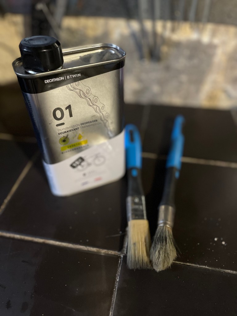 This Decathlon cleaner is fantastic for it. Use some simple cheaper paint brushes to apply. For brushes there is no need for high-end horse hair etc. I tend to find some great cheap ones in the supermarket. Apparently they are for cleaning stuff in the house (no idea where) but I just found a 2 euro one that is indispensable for cleaning around wheel hubs and between cassette chains rings. You can also go for a chain cleaner and yet again Decathlon do a great cheap one (see pic below)