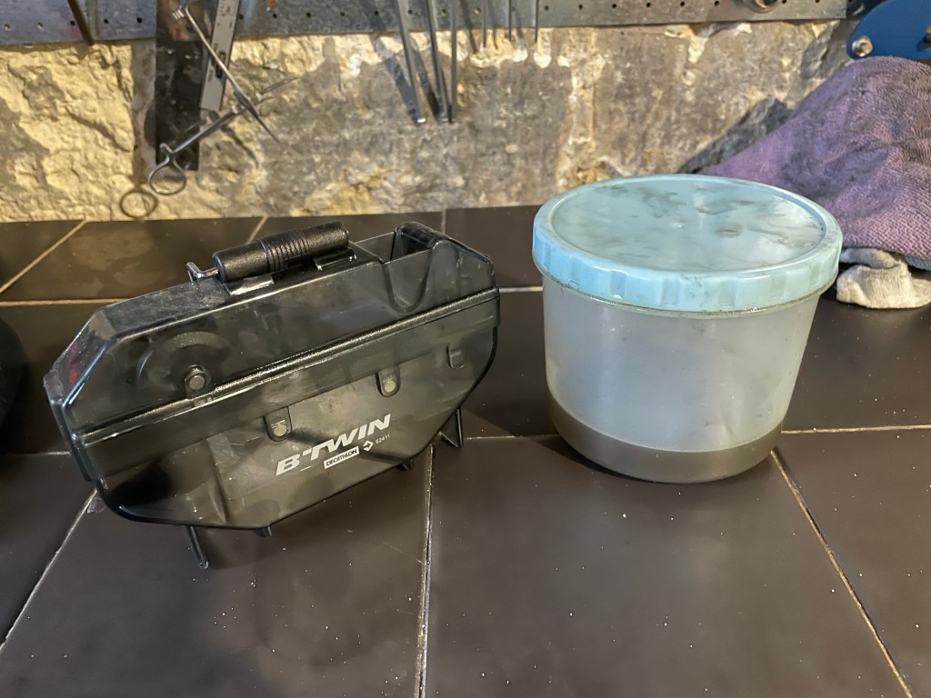 You can spend a lot more on “cooler” brand ones but the Decathlon one does just as good a job and money spent can be used on more important things like the pub after a ride. A lot of Decathlon stuff is soooooo good, no need for snobbery. One of the best sets of gloves I have I got can from there, beating 60 euro goretex jobbies for a quarter of the price. The pot in the pic is for awful chains – in the worst case pull the chain off (much easier if you have a quick link but don’t reuse them too many times). An overnight soak sorts most sins.