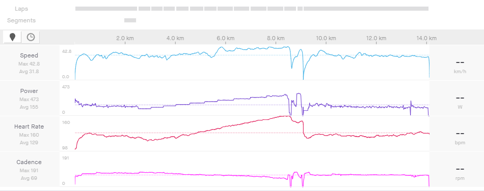 As you can see from the above you get a short warm up and then starting from 100 watts it increases power by 20 watts every one minute (please don’t give me grief for numerals and spelling out numbers in same sentence!).