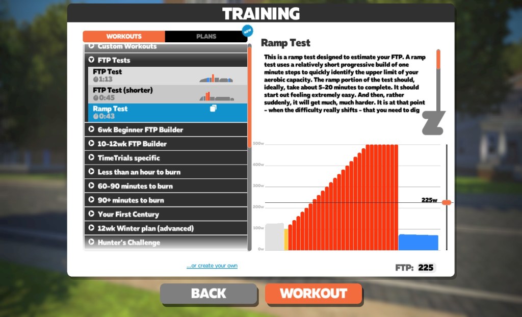 ZWIFT has a number of build in FTP tests, basically two tests of differing duration and a RAMP test. I decided I wasn’t ready as yet for the more traditional FTP and went for the RAMP feeling it would be gentler on my still painful joints. It was a good choice as I’ll recover quicker and will be commuting tomorrow in the morning.