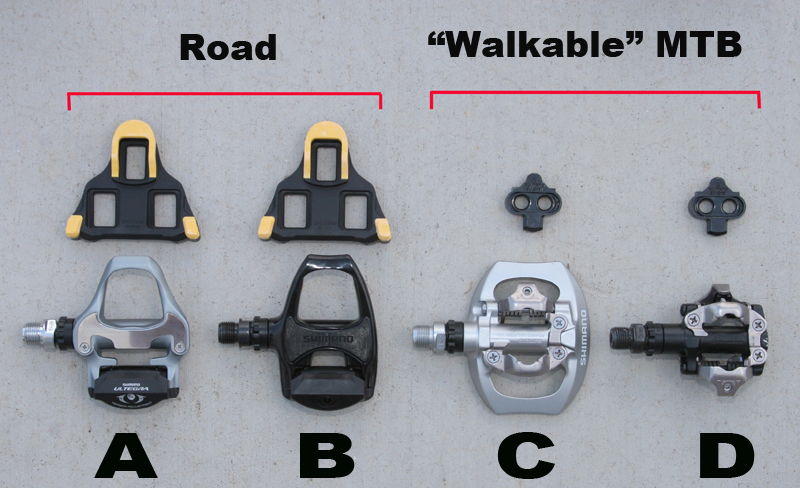 So very crudely we have two basic systems to cleated pedal. The road version and the offroad… or basically Shimano, LOOK, SRAM road systems vs the SPD (which stands for Shimano Pedaling Dynamics). Below you can see the basic differences. This image is from https://handsonbike.blogspot.com/2012/03/clipless-pedals-on-dahon-boardwalk.html and is assume. I hope you don’t mind me using it…